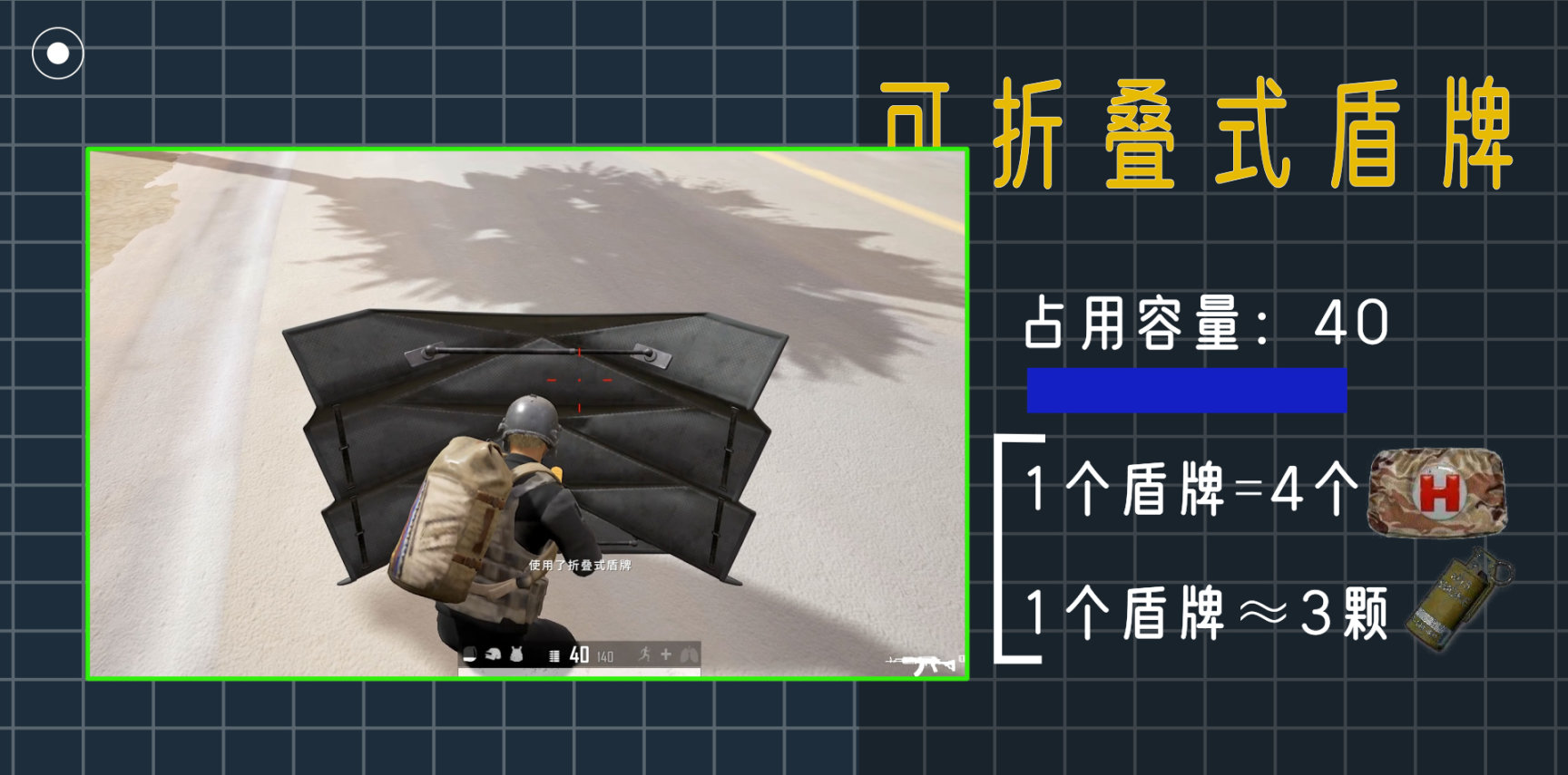 可折叠式盾牌的占用容量为40,这意味着它不占用主武器栏,可以单独放在背包中。也就是说,1个盾牌占用量等于4个大包的占用量。或者约等于3颗烟雾的占用量