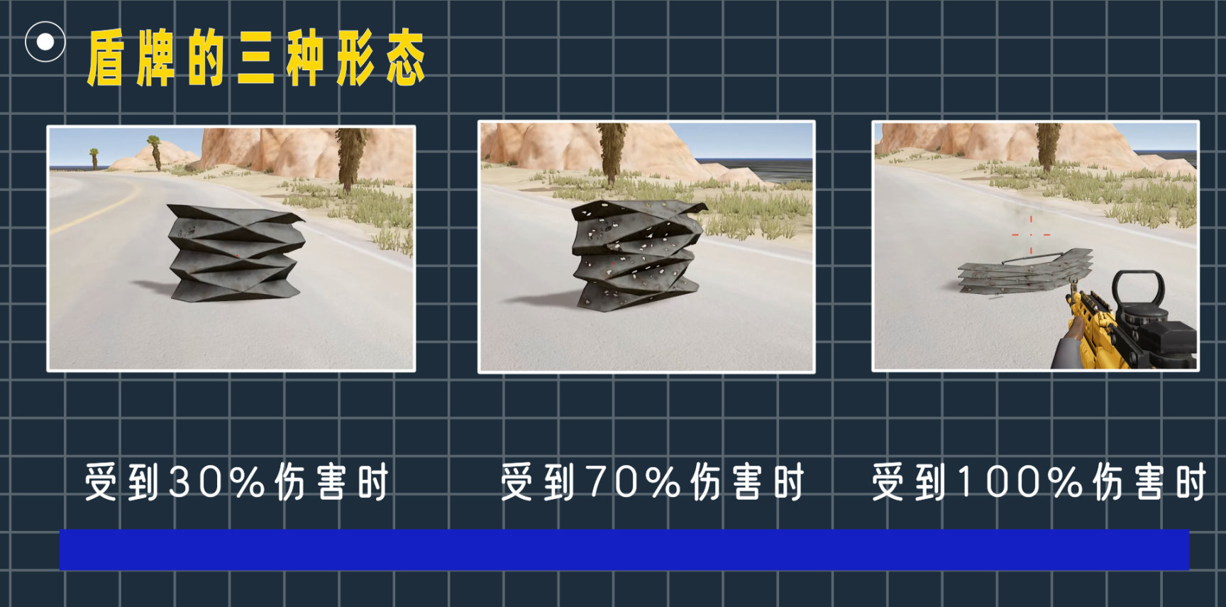 盾牌的耐久值为1500,受到伤害时,没有护甲加成,皆为真实伤害。经过用Beryl762测试,大约11颗子弹,盾牌会受到30%伤害。大约24颗子弹,盾牌会受到70%伤害。大约35颗子弹,盾牌会被摧毁,完全消失。以上三个伤害节点,盾牌也会呈现不同的状态