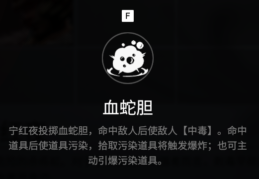 宁红夜 西出昆仑的盲剑客,美丽危险的赤练蛇。对于宁红夜这样的强者而言,剧毒早已刻入血脉,利刃则永不离身边。而被遮蔽的双眼,将在宿命来临时再次凝视世界。 血蛇胆 宁红叶投掷血蛇胆,命中敌人后会让使敌人“中毒”,命中道具后会污染道具,如该道具被拾取将触发爆炸;也可主动引爆污染道具 赤练无明 宁红夜释放昆仑秘术,在秘书结束时,对周身范围内的敌人造成伤害和长时间眩晕。