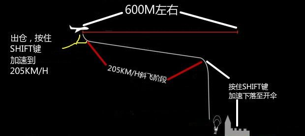 一句话总结:距离目标点600米下飞机,先垂直加到205KM/H左右,再斜角保持205KM/H左右一直超目标点飞,距离120米左右垂直加速到231KM/H以上开伞。