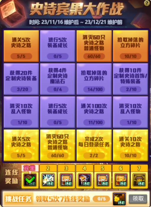 玩家参与史诗宾果大作战活动,完成连线任务就可以获取史诗之路增益随机礼盒、史诗之路增益自选礼盒。这里提醒各位玩家,奖励在每周都会重置,各位玩家记得每周都要参与该活动哦。