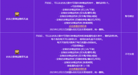商城上架的两个克里帕的旅行之路礼包,分别包含了史诗之路增益随机礼盒、史诗之路增益随享礼盒,玩家缺少资金的话,购买990点券的克里帕的旅行之路礼包即可。这里注意,史诗之路增益礼盒每天都可以开启1次,玩家记得刷活动副本前,一定要开一下礼盒哦。