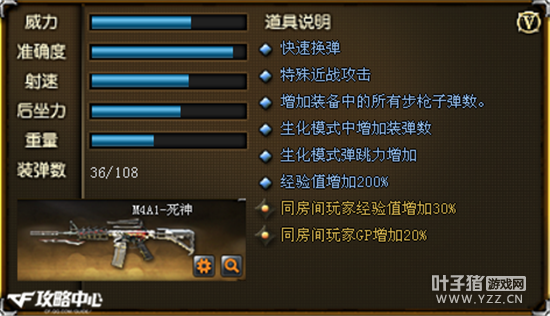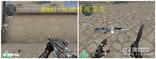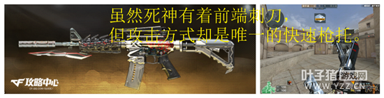 在死神的官方介绍中这样写道:“此枪一出,犹如冥界死神降临,横扫一切战场敌人。”对死神如此高的评价也算有据可依。首先是死神拥有的多种特殊属性:包括快速换弹、经验加成、特殊近战攻击等常规英雄级M4属性,外加自己独特的生化模式中佣兵弹跳能力增加属性。对于外加属性小编在这里想啰嗦几句,很多玩家知道死神有这个属性,但并不是很清楚究竟增加了多少弹跳。举例来说:在手持死神作为主武器时,生化模式中金字塔这张地图,通过“W+S按住,空格到最高点蹲”的简单身法可以很轻松的到达金字塔顶端的石块上。而没有死神弹跳加成的状态下,手持小刀也未必能利用这种方法上箱;生化模式中持有死神的弹跳相当于一个小红或是绿巨人的弹跳。