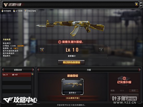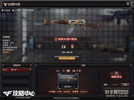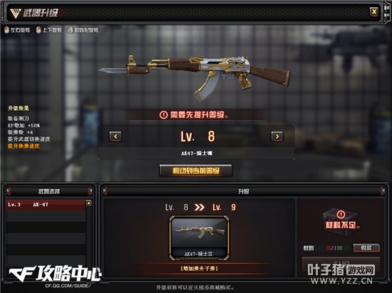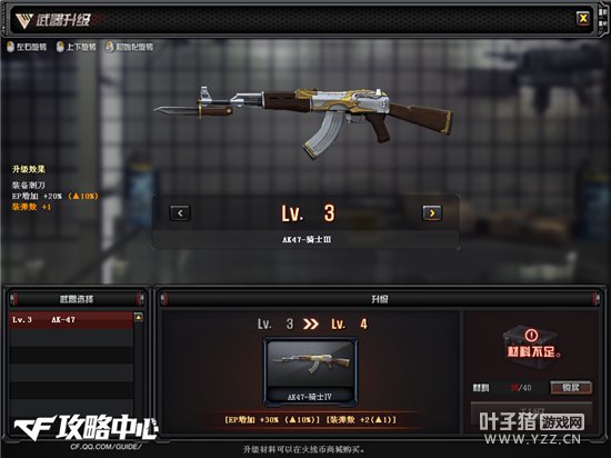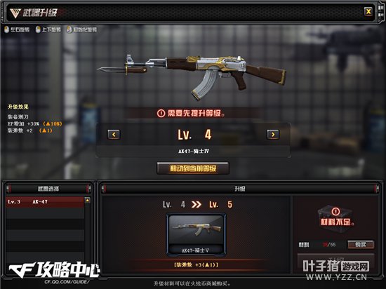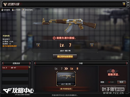 1级的武器就是普通的AK47,玩家第一次升级时,系统会自动赠送一定数量的升级材料包,武器只能通过材料包升级。