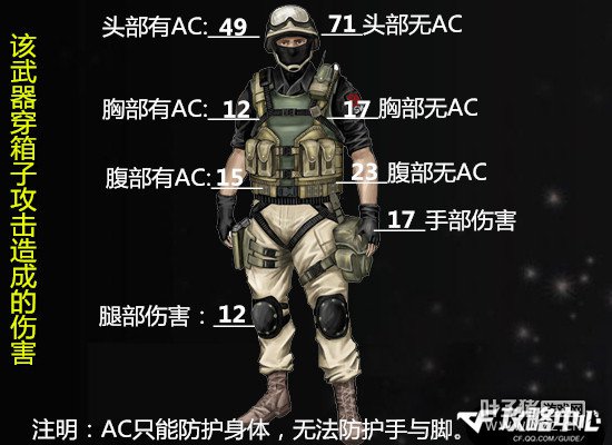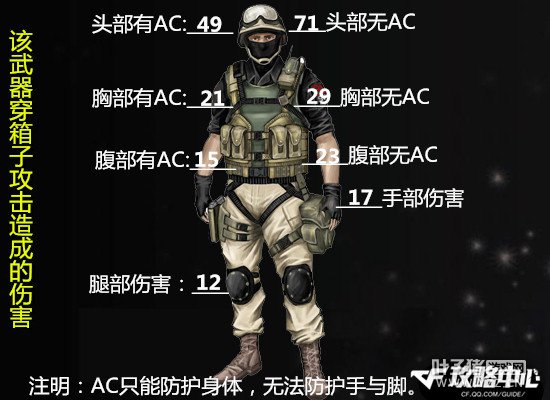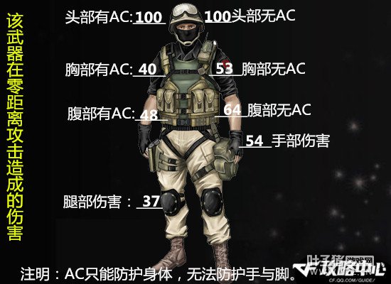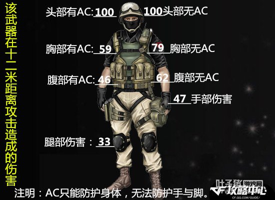 伤害爆炸啊有木有,如此之高的伤害。爆头一枪秒杀,若是敌人没有AC的话射击胸部的伤害居然高达90HP。非常惊人,就算敌人有AC射击敌人胸部也能打出67这样高的伤害!一定要记住,普通状态下射击胸部的伤害是高过于腹部的!实战过程中若是射击敌人头部困难就选择直接射击胸部,只要命中两发就致命!
