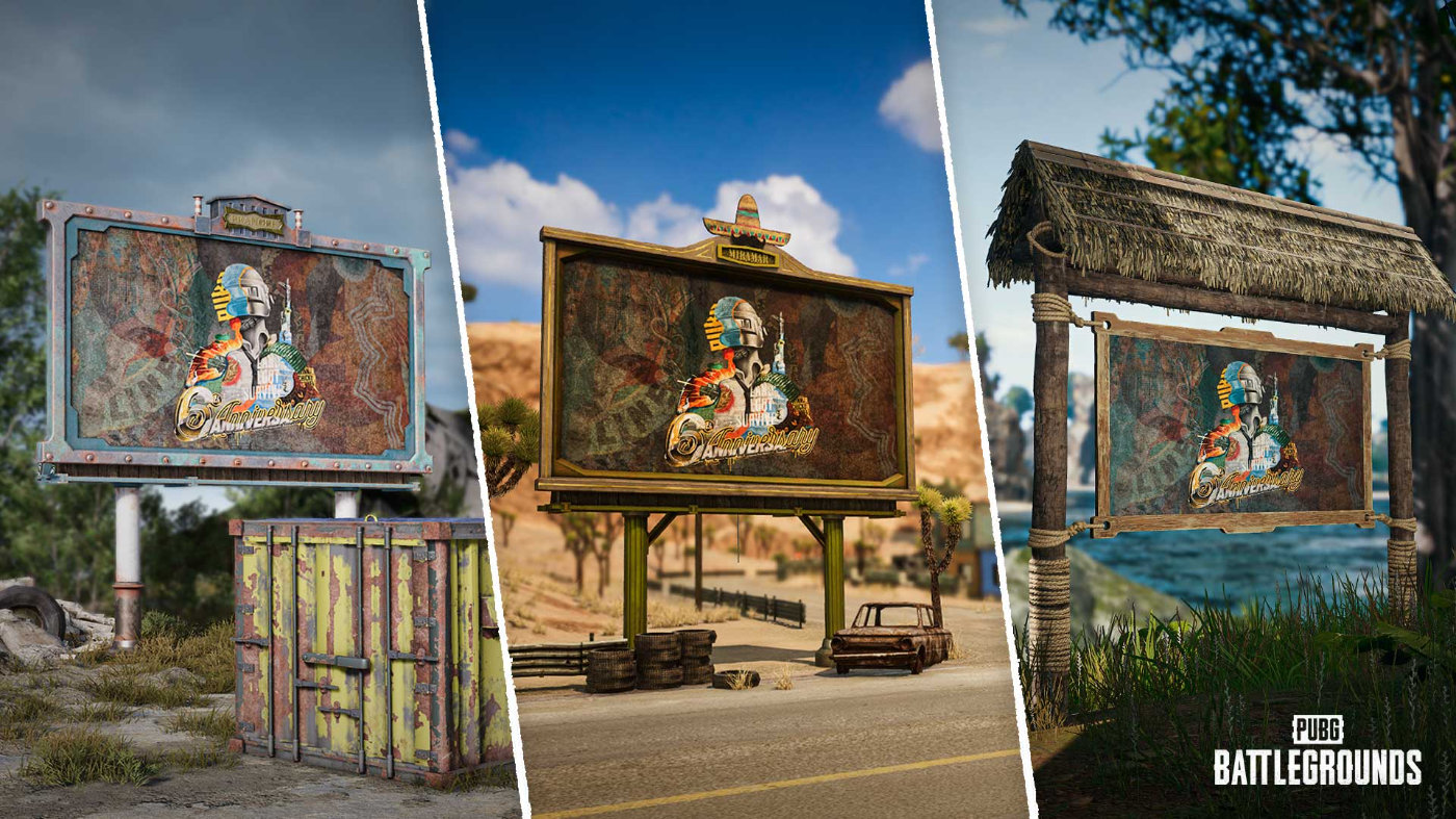 PUBG 6周年生日快乐!艾伦格、米拉玛和萨诺地图的各处都已添加了6周年纪念的电子屏和建筑装饰。