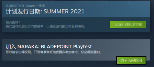 2、 点击下方【NARAKA:BLADEPOINT PLAYTEST】的绿色按钮【请求访问权限】