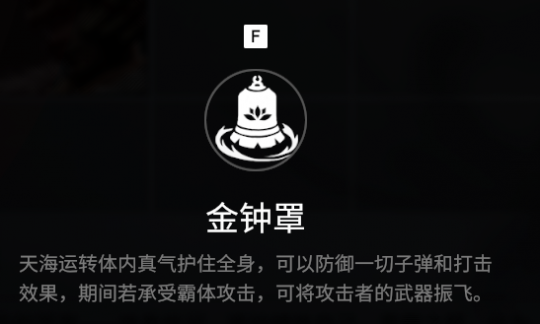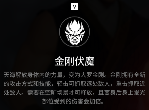 天海 云游天下,他终于找到心中答案——挽救世间,哪怕牺牲自己。雷霆之怒,化为嗔怒金刚,扫除一切业障,而拦路者,将承受无尽怒火。 金钟罩 天海运转体内真气护住全身,可以防御一切子弹和攻击,期间如果承受霸体攻击,可将攻击者的武器振飞。 金刚伏魔 天海会变为大罗金刚。金刚拥有全新的攻击方式和技能。轻击可抓取远处敌人,重击抓取近处敌人。