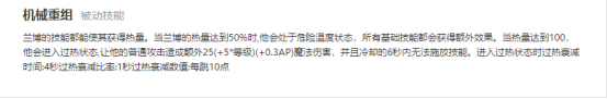 兰博的温度机制是因其被动效果,兰博的被动【机械重组】会计算兰博的机械温度,当机械温度达到50%时,兰博将会处于危险温度状态,所有基础技能都会获得额外效果。当温度达到100%的时候,兰博将进入过热状态,普攻将会造成额外的伤害,但是在6秒内无法释放技能,直到温度降为0。