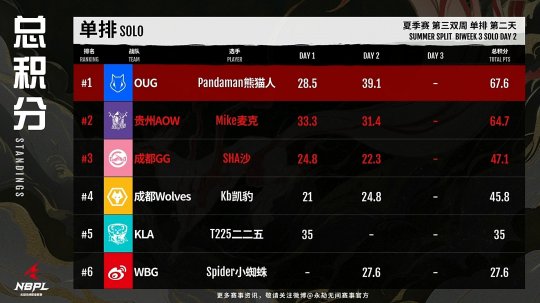 作为NBPL夏季赛迄今为止发挥非常稳定的选手,OUG.Pandaman以亮眼发挥赢得了观众的肯定。虽然在前两个双周的单排周决赛中都是遗憾与周冠军失之交臂,但是他总能在积分榜上名列前茅,足以证明他的个人能力绝对逊色于Mike、小蜘蛛这些顶尖的单排选手。而在第三双周结束了为期两天的单排周常规赛后,熊猫人以67.6的超高积分位居榜首。