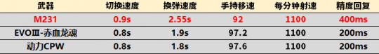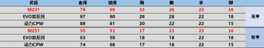 小结:基础威力较低,但得益于甲修优势,在如今人均双甲的情况下DPS基本等于1100射速的两把冲锋枪。距离修正在步枪中虽然较高,但是作为对比的两把冲锋枪距离修正接近1%(EVOⅢ为0.98%,动力CPW为0.95%),随着距离的提升,M231的优势将会更明显。