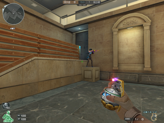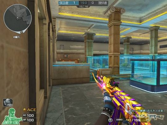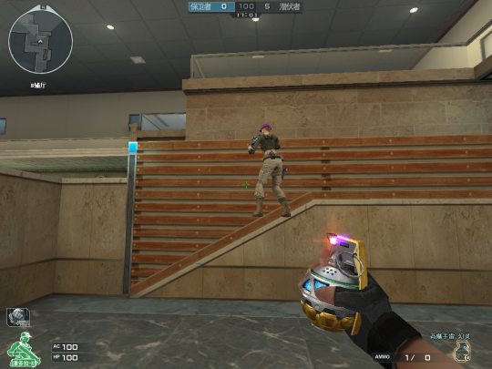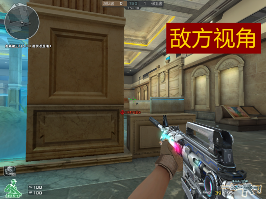 如上图所示,当我们站在小箱子时,可以先保持蹲姿状态,避免被敌人平台上的敌人发现,当我们通过地图中间的玻璃水箱发现敌人进入辅道后,便可以起身对敌人进行攻击。