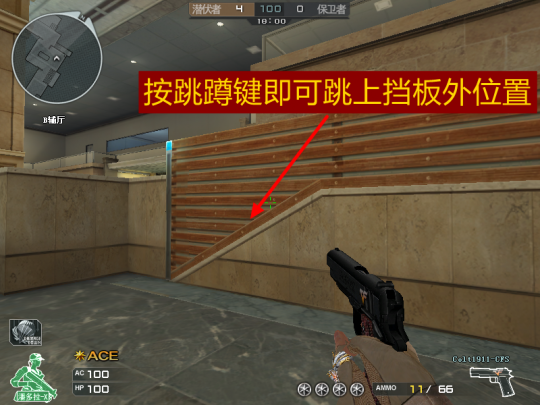 如上图所示,当我们在水族馆这张地图中拿下一侧通道后,可以在敌人家平台挡板外位置对敌人进行一波火力压制。在平台挡板外有一个狭小的空间可供我们站立,玩家们可以灵活地利用起来!