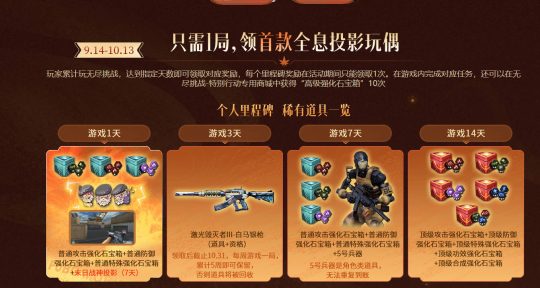 官方为了让大家让玩家在无尽挑战新赛季这条路上越走越顺,在近期也是推出了相关的福利活动,玩家只需累计游玩无尽挑战天数即可,一些顶级的强化石宝箱也都在这里产出,相较于每周游戏内产出的强化石来说获取门槛更加容易。同时末日战神投影玩偶只需游戏1天即可领取,在目前的商店中需要肝好久才可以获取的终极奖励如今以抢先体验的形式做客活动,抓紧时间来获取吧!
