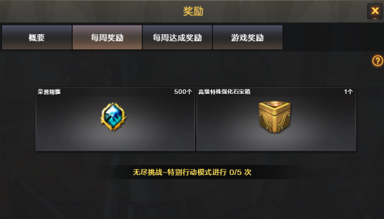 要想稳定且拿到较多的强化石,每周奖励、每周达成奖励和游戏奖励就是最主流的方式,完完全全看玩家们的毅力。新手期可以优先选择比较容易的每周奖励,只要完成5局新无尽挑战游戏即可获得1个高级特殊强化石宝箱+500荣誉精髓,这些条件足以让玩家们实现滚雪球式经营。