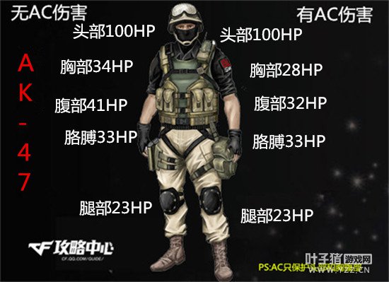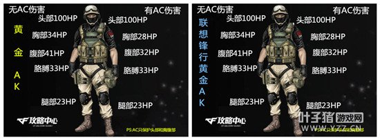 黄金AK和联想锋行AK的主要区别就在于护木的不同,黄金AK属于棕黄色并且有两条黄金花纹,而锋行AK护木变成了黑色,上端有联想的lenovo的标示,并且在锋行AK的枪身上也有联想的英文标示,而枪托也是不同的(虽然第一视角看不到)不过仅仅颜色改变了,花纹什么的并没有变化,所以说到底哪把枪外观更漂亮就不那么容易判定了。 伤害对比测试