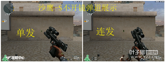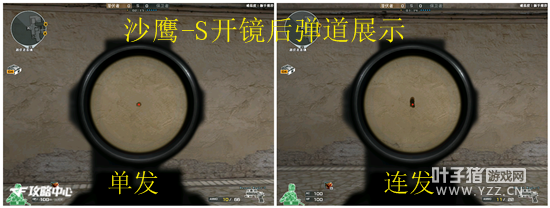 关于沙鹰系列的弹道,小编相信友友们也很熟悉了,沙鹰的单发子弹不存在偏差,而射速方面沙鹰也确实很难做到连发;这一点情有可原,毕竟沙鹰不是像AK47那样的大块头,如此精致的副武器还要兼顾威力和射速却是有些牵强了。但若用速点的打法将沙鹰子弹快速射出,还是可以观察到沙鹰的弹道如同玩家直观看到的沙鹰枪身上下抖动一样,子弹也是向正上方偏移的。所有的沙鹰系列弹道都相同,沙鹰-S也不例外;小编将沙鹰-S的弹道图以及开镜弹道图整理如下,以供玩家参考。