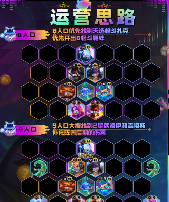 2.阵容羁绊:6格斗家4耀光3迪斯科2电子舞曲1高能流行