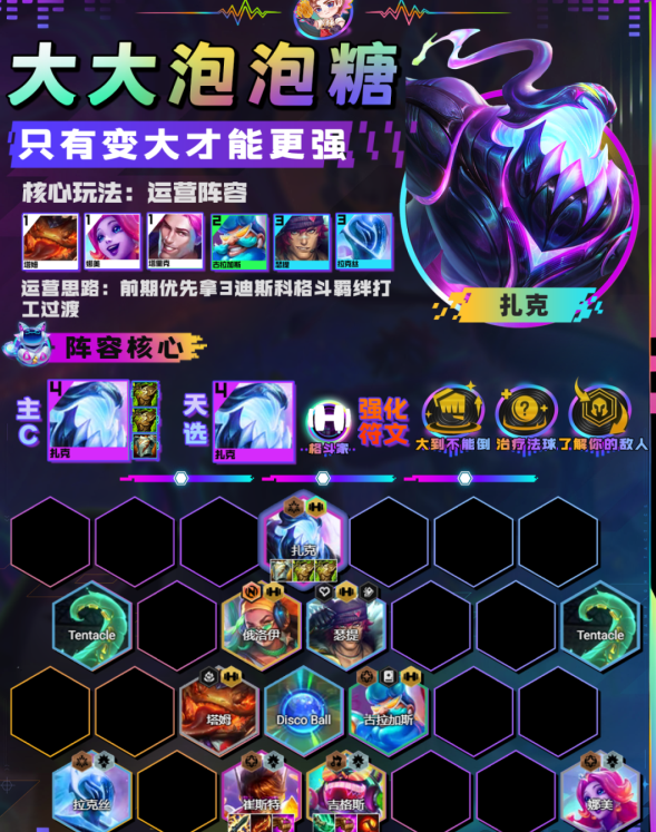 金铲铲之战s10大大泡泡糖阵容的玩法是怎么样的呢?金铲铲之战是很多玩家喜欢的手机端自走棋竞技游戏,有着很多强力阵容组合的搭配,各类玩法阵容的开发更是极为有意思的,近期大大泡泡糖阵容的玩法也是很多玩家所感兴趣的,下面就一起看看怎么样玩。