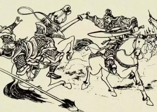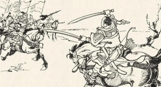 “再遇手挥双刀......金将有持双铁简跃马而前,再遇以左刀格其简,右刀斫其胁,金将堕马死。”