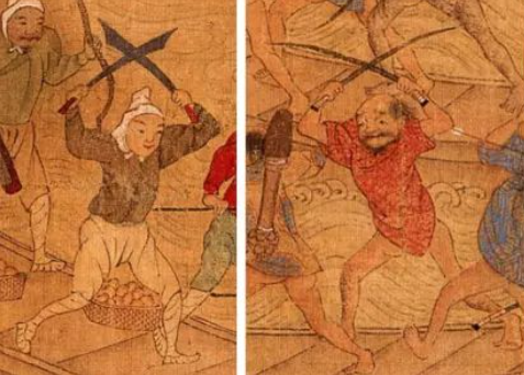 现藏日本东京大学史料编纂所的《倭寇图卷》,有一名手持双刀的明军士兵,其持刀姿态与右侧的倭寇完全一致,只是其手中所持兵器,为中国传统的手刀类型,而非右侧倭寇手中的倭刀刀型。